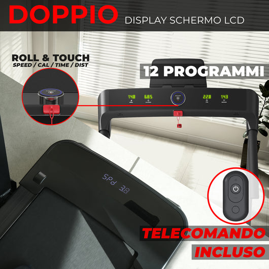 Regola e controlla il tuo allenamento grazie ai due schermi LCD di cui è dotato il tapis roulant Raffaello. In entrambi i display potrai visualizzare Tempo, Velocità, Distanza e Calorie. Controlla le funzioni tramite l’apposita rotella (ENCODER), o tramite il comodo telecomando in dotazione. Programmi preimpostati: 12.