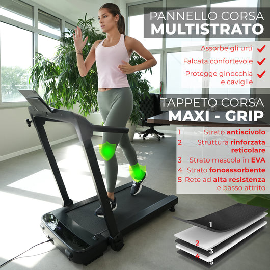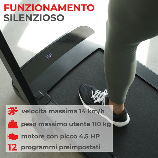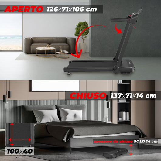 Corri fino a 14 km/h. Quando non lo usi puoi comodamente riporlo sotto il letto o il divano (spessore da chiuso solo 14cm), è compatto e facile da usare e spostare. Include 12 programmi preimpostati.