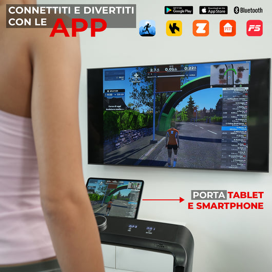 Rendi i tuoi allenamenti più stimolanti e divertenti usando le APP compatibili (ZWIFT, KINOMAP, BITGYM e FITHOME) che consentono di proiettare video e percorsi di allenamento direttamente su TV, Smartphone e Tablet. Potrai anche condividere l'allenamento con i tuoi amici, seguire allenamenti strutturati e raggiungere sempre nuovi obbiettivi. Prova anche la funzione musica motivazionale, il video coaching, la cronologia allenamento molte altre funzioni.