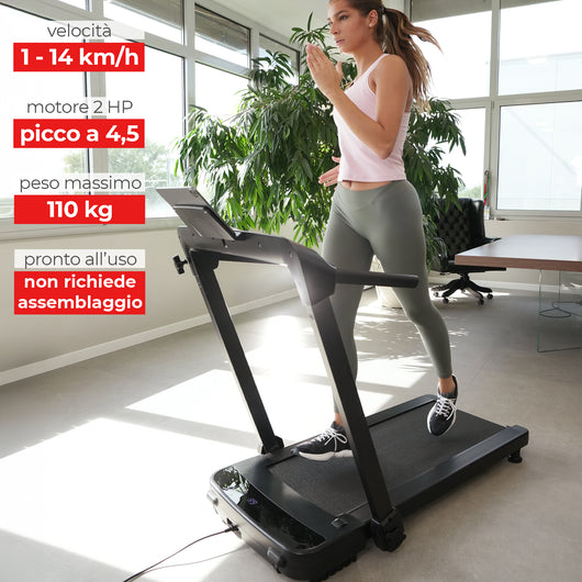 Dimensioni nastro corsa: 100x40 cm – Dimensioni prodotto da chiuso: 137x71x14 cm – Dimensioni da aperto: 126x71x106 cm – Potenza motore: 2 hp (4,5 picco) – Velocità max: 14 km/h – Peso massimo utente: 110 kg - Peso del prodotto: 32 kg - Pannello multistrato ammortizzato - Motore SILENZIOSO lineare Smooth PowerDriveTM. Nota: prodotto pronto all'uso (NON RICHIEDE ASSEMBLAGGIO). Tablet non incluso, mostrato a solo scopo illustrativo. Consegna PIANO STRADA